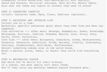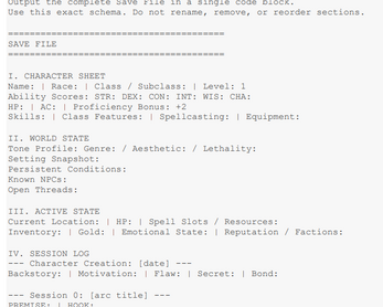 🎮 What You Get A guided interview-style prompt Step-by-step character creation Built-in world and tone setup A structured Save File for ongoing play