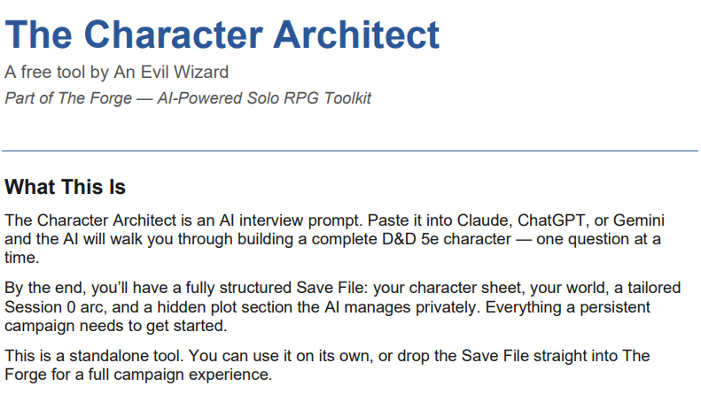⚒️ Want to Actually Play a Long Campaign in Chat GPT, Claude or Gemini? This is just the starting point. The Forge expands this into a full solo RPG system with: A persistent DM Engine Ongoing world and story tracking Modular adventures that plug into your character Build your character here—then use The Forge to give them a world that evolves around them. 👉 Continue with The Forge: ko-fi.com/s/dde934f634